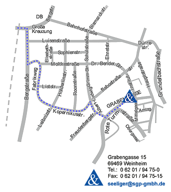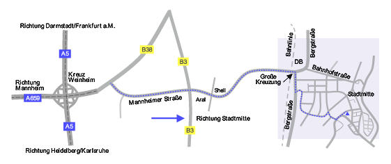Anfahrt ab Kreuz Weinheim:Direkt nach der Abfahrt rechts Richtung Weinheim - Stadtmitte fahren.Auf der Mannheimer Straße immer geradeaus Richtung Stadtmitte.An der großen Kreuzung (am Bahnhof) rechts abbiegen Richtung Heidelberg, Rathaus.Die nächste Ampel links Richtung Rathaus fahren.Dem Fabrikweg und der Kopernikusstraße den Berg hinauf folgen.An der nächsten Möglichkeit rechts Richtung D3 Hermannshof, Marktplatz auf dieAlbert-Ludwig-Grimm-Straße abbiegen.